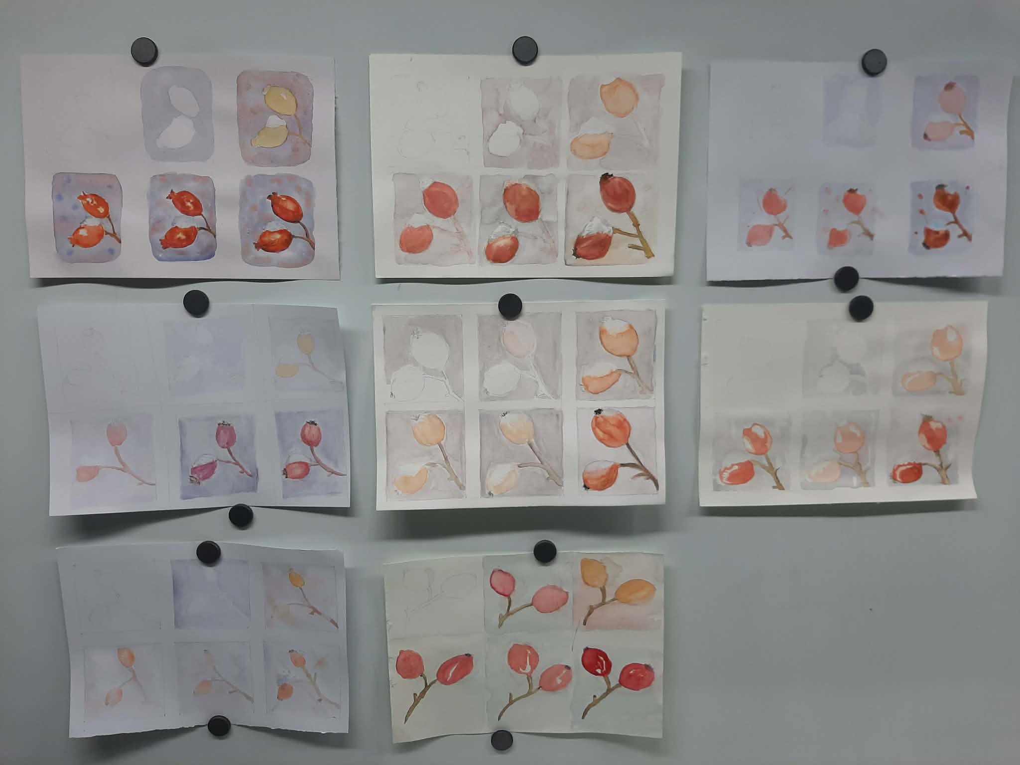 Na delavnici smo zato zavestno izbrale drugačen motiv: skromen, ponovljiv šipek. Omejitev motiva ni pomenila poenostavljanja, temveč preusmeritev fokusa. Udeleženke so delale v manjših zaporednih poljih, kjer so lahko opazovale, kako se barva obnaša na bolj ali manj mokri podlagi, kako se ton gradi plast za plastjo in kako pomembno vlogo ima čas – trenutek, ko se odločimo nadaljevati, in trenutek, ko je treba počakati.