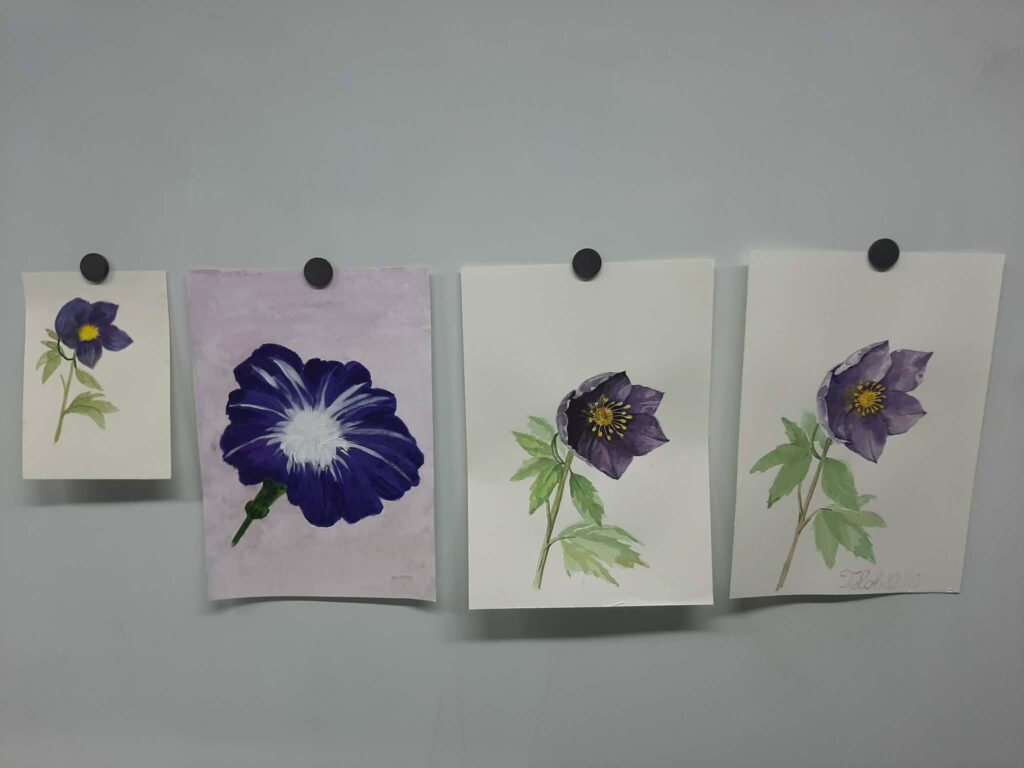 Zanimivo je, da so nekatere udeleženke že pred delavnico doma slikale zahtevnejši motiv – črne telohe. Ta dela razkrivajo ambicijo, izrazito zanimanje za botanične motive ter željo po globokih tonih in kontrastih, hkrati pa tudi tipične izzive akvarela: obvladovanje temnih barv, robov in transparentnosti. Prav ta izkušnja je bila pomembno izhodišče za delavnico – kot tiha potreba po počasnejšem, bolj razgrajenem pristopu.
