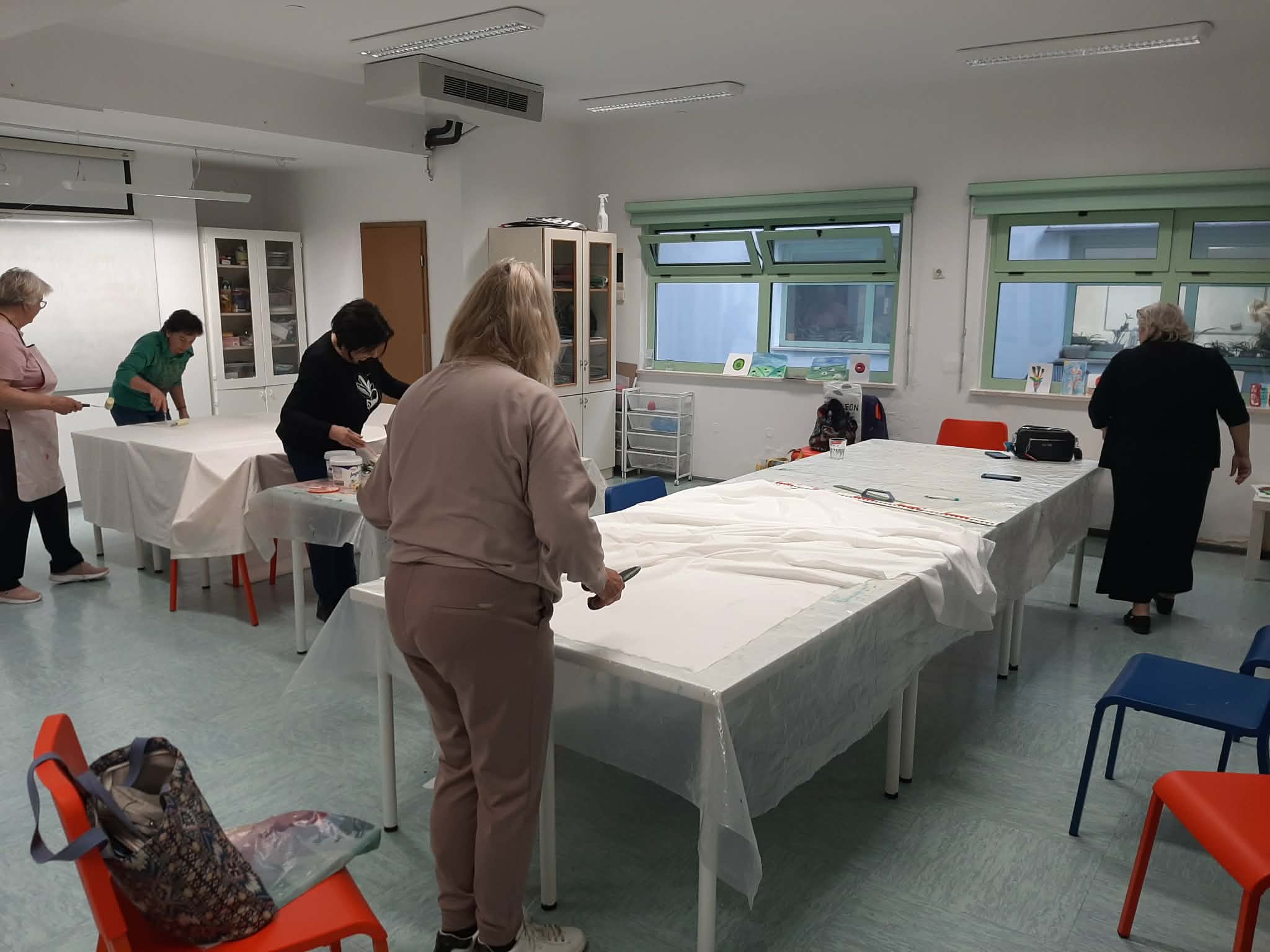 Izmerile in razrezale smo manjša platna (54 × 74 cm) ter pripravile tudi veliko skupinsko podlago. Sledilo je nanašanje podlage na vsa platna.