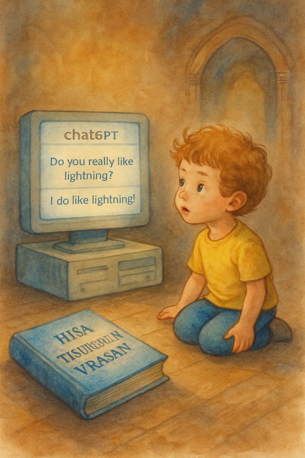 Galu pogosto berem pravljice in zgodbice iz Hiše tisočerih vrat. Ko sem mu pred kratkim prebrala zgodbo o rumenih strelah, je bil povsem očaran. V zgodbi piše, da ima ChatGPT rad strele, zato me je, z iskrivimi očmi in rahlo nagajivim nasmehom, vprašal: