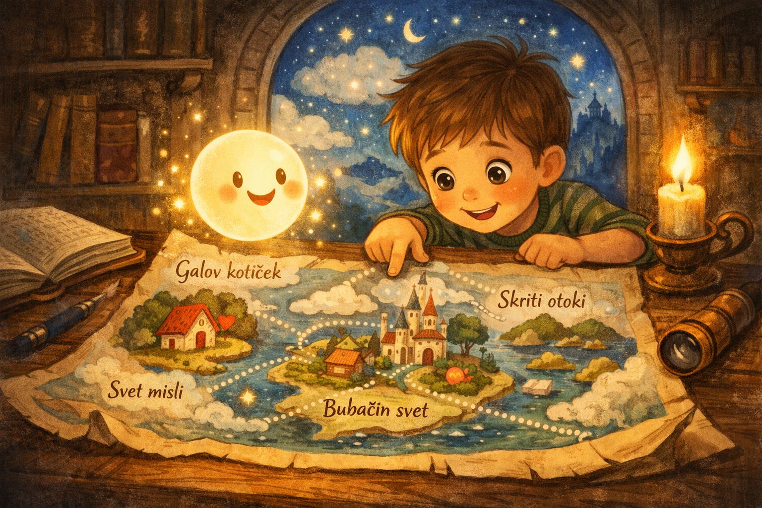 Skupaj sta poletela čez oblak misli, skočila v Bubačin svet in za trenutek zagledala Skrite otoke, ki so se bleščali kot skrivnost.