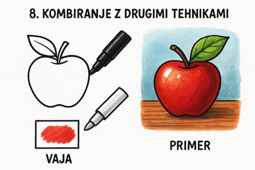📘 MARKERJI V desetih korakih do ustvarjalnosti “”Vsaka poteza markerja je nova priložnost za barvo, obliko in domišljijo.” Obrazložitev: Ko je risba končana: Poskeniraj ali fotografiraj, saj barve sčasoma zbledijo. Delo lahko fiksiraš s sprejem za risbe (fiksativ). Hraniti ga je najbolje v mapi s plastičnimi ovitki. Vaja:Dokončaj risbo, jo fotografiraj
