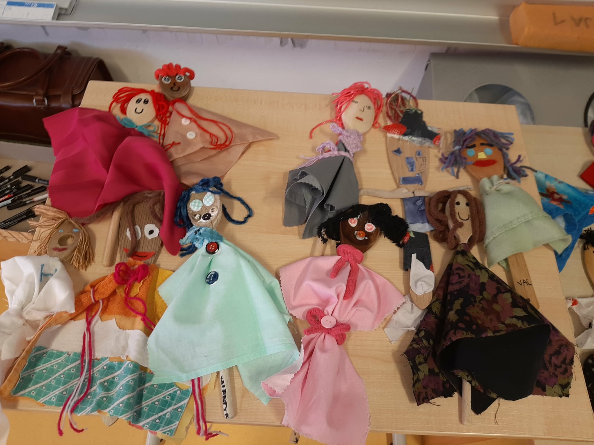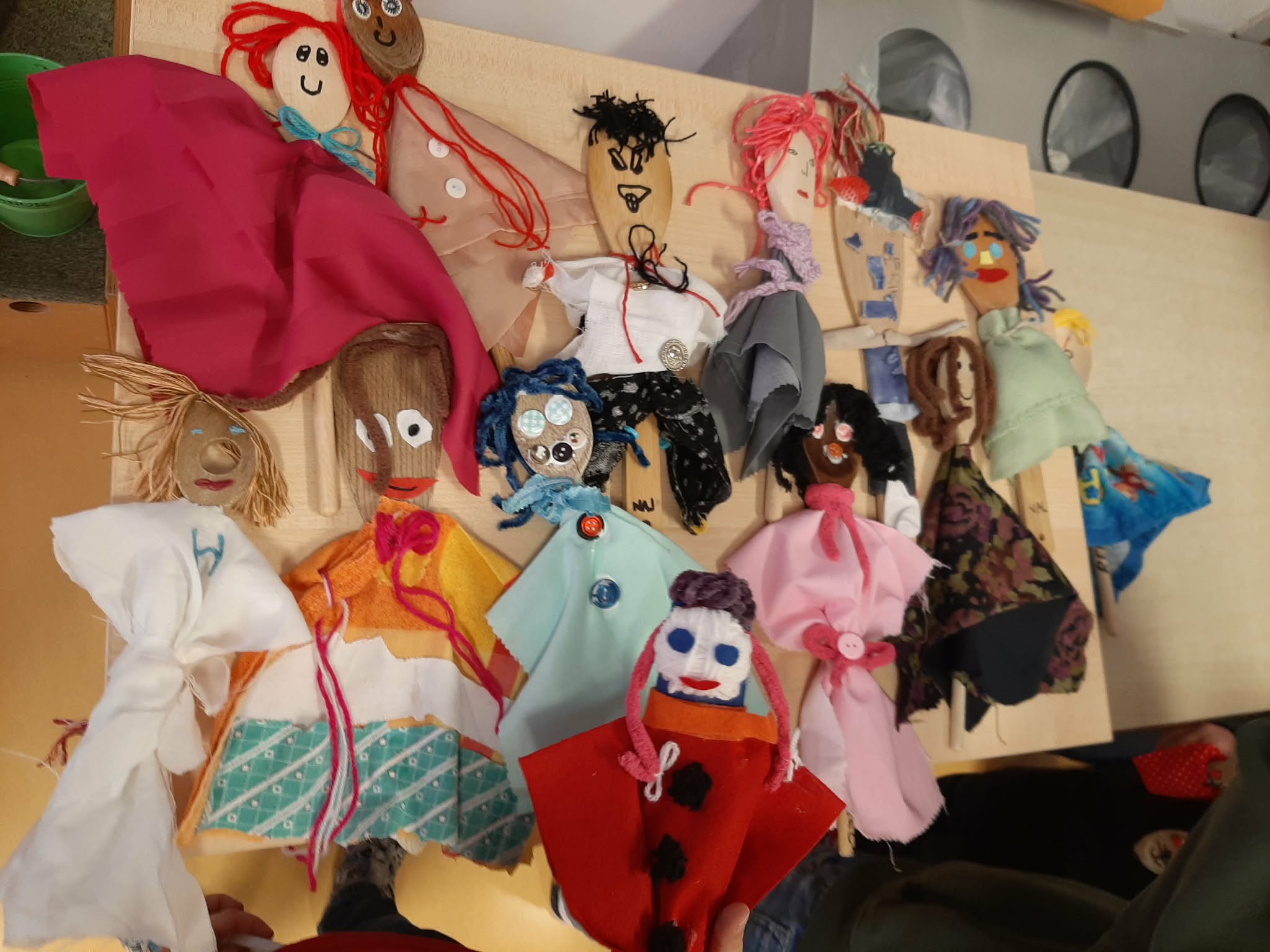 Takrat jim je povedala, da bomo spoznavali stare igrače, ki so jih prinesli stari starši, nato pa bomo skupaj izdelovali lutke iz lesenih kuhalnic, blaga in volne.