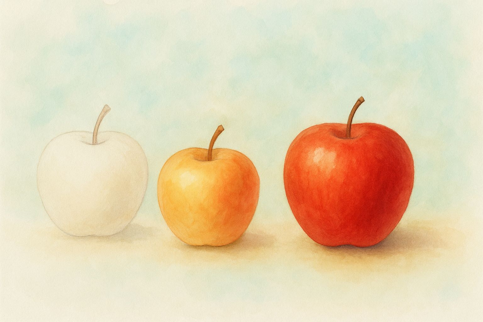 2️⃣ Druga – kompozicijsko mirna, s tremi jabolki, ki iščejo ravnotežje med toplino in svetlobo.