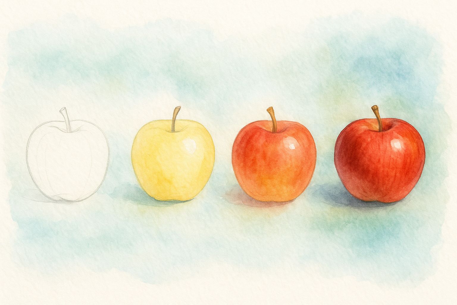 Naloga je bila preprosta: naslikati tri jabolka v vrsti in pri tem spoznati plastenje, svetlobo ter potrpežljivost, ki jo zahteva mokri papir.