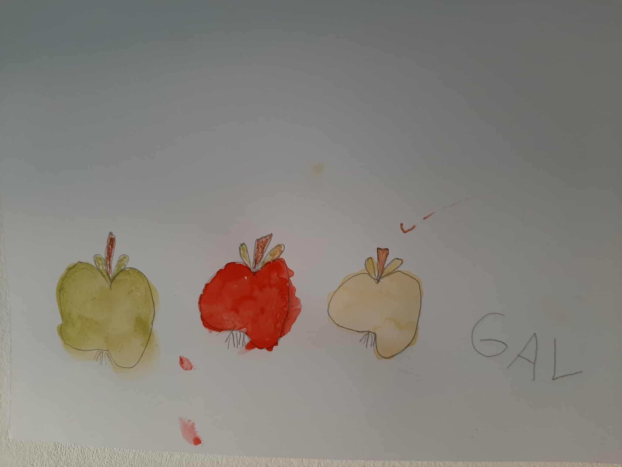 Šestletni Gal je v svojem delu ohranil bistvo naloge: tri jabolka v vrsti, vsako v drugačnem tonu – zelenem, rdečem in rumenkastem. Slikal je po načelu “mokro na mokro”, pri čemer je barva svobodno stekla znotraj risbe in ustvarila nežne madeže, značilne za otroško spontanost.
