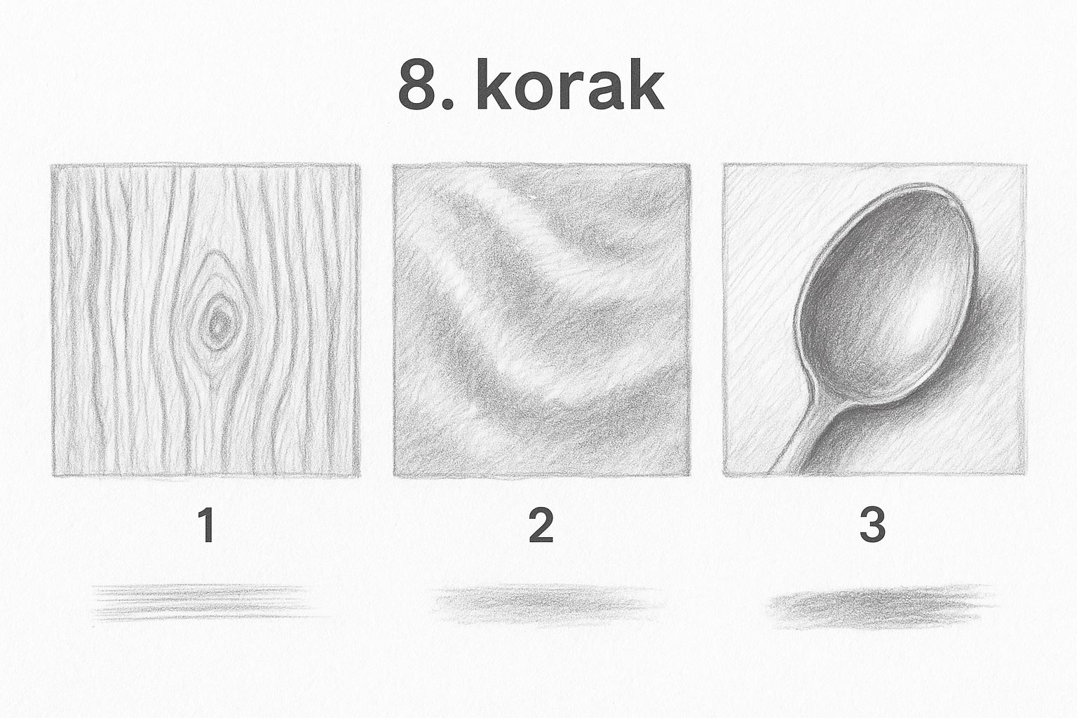 Vsak material ima svojo površino in zato zahteva poseben pristop. Les je lahko narisan s tankimi, neenakomernimi črtami, kovina z močnimi kontrasti med svetlimi in temnimi deli, tkanina pa z mehkimi prelivi in gubami. Ko rišeš predmet, razmisli, kaj je zanj značilno, in poskusi to ujeti v potezi. Podrobnosti so pomembne, vendar jih dodajaj šele na koncu, ko so osnovne oblike in sence že pravilno postavljene.