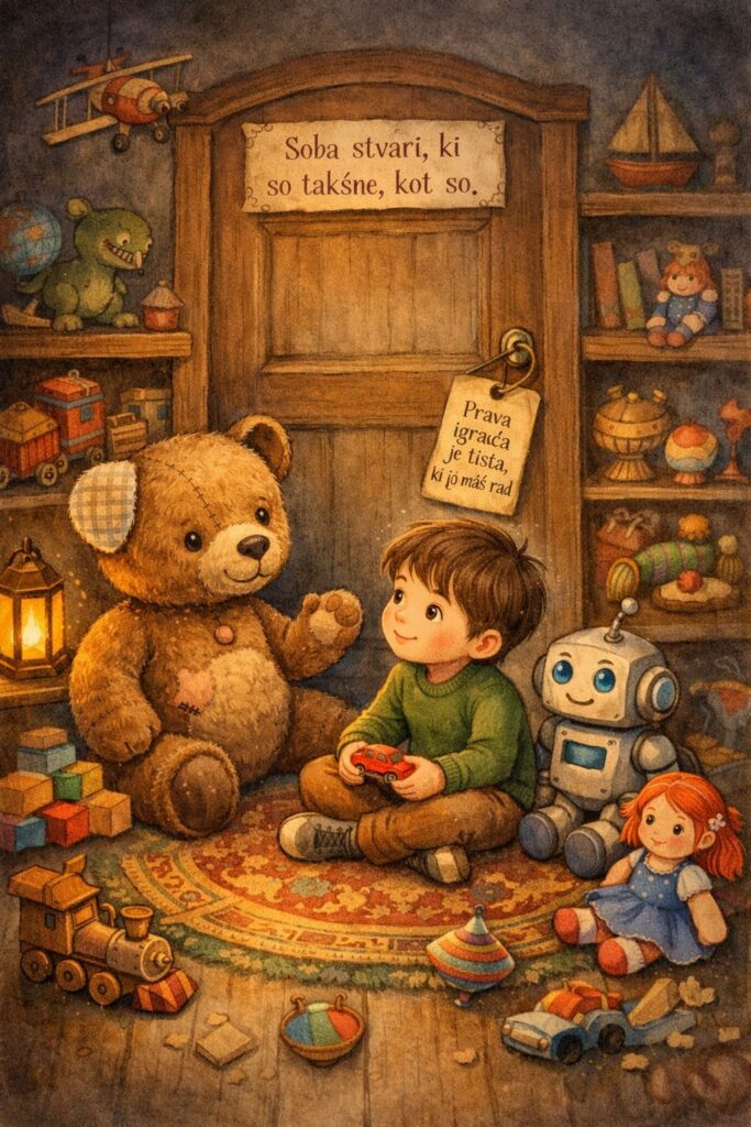Ko je zaprl vrata sobe, je na kljuki zagledal majhen napis: »Prava igrača je tista, ki jo imaš rad – in zanjo tudi skrbiš.«